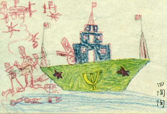 美国坏蛋的飞机到我们海边来了,海军叔叔把飞打坏了,一个个的坏蛋都掉下水淹死了。