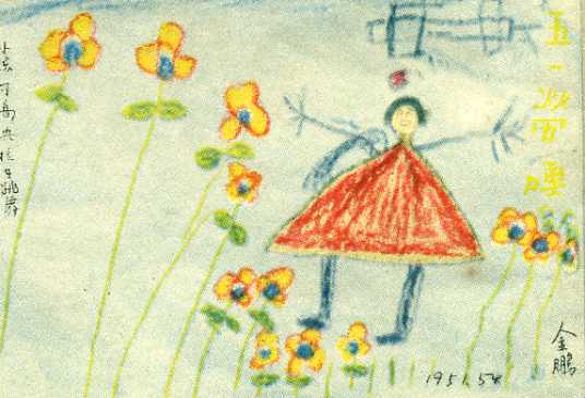 在“五一”劳动节的时候,毛主席在天安门检阅,叔叔阿姨们在街上示威大游行,飞机在空中撒传单,小朋友们在花园里高兴地跑着、嚷着抢传单。