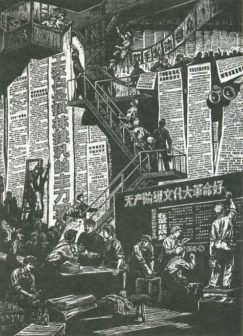 版画《大摆战场》李融龙(工人)、纪渭和、娄春亭