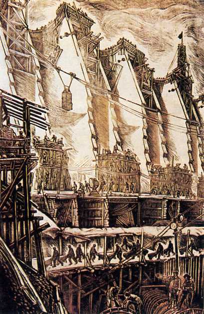 版画《建设中的佛子岭》(48.7x30.8cm)陈烟桥 1957年