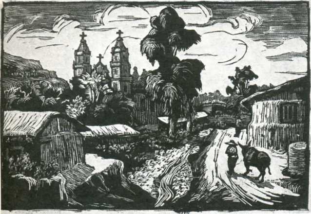 版画《延安鲁艺校景》(14x20.5cm)苏晖 1944年