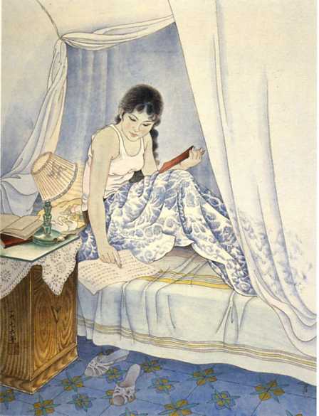 中国画《夜读》(63.5x49cm)彭本人 1976年
