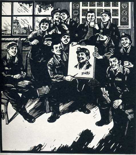 版画《画画我们的老队长》郭礼成(工人)