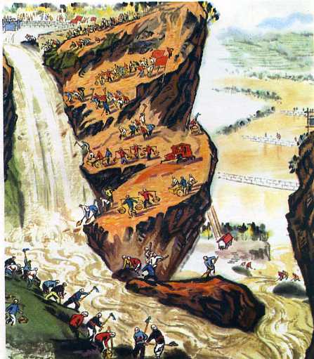 (5)劈山改河换新天,洪波一泻千里远。千锄万镐织锦绣,荒滩修成大寨田。