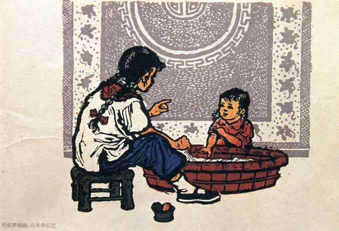 版画《姐姐帮妈妈,我来帮姐姐》(17.6x20cm)邓柯 1957年