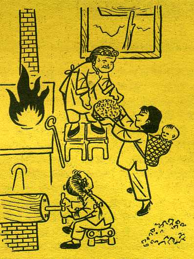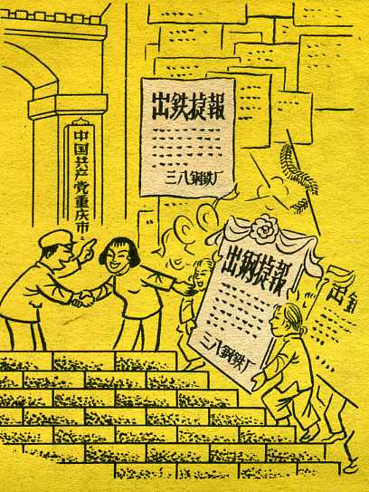 重庆南岸区,流传事一桩。有位老太太,自建炼钢厂。媳妇把料上,女儿拉风箱。灶头改钢炉,炼出上好钢。