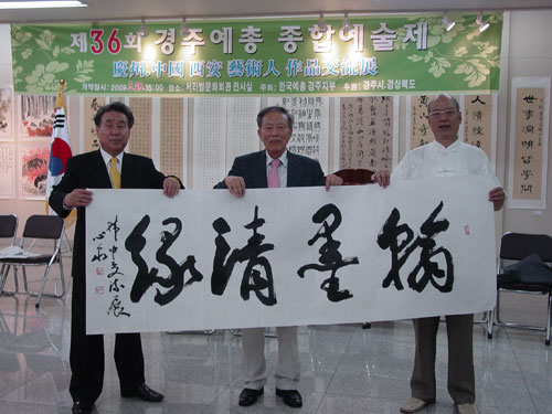 “中韩书画作品联展”开幕式上,韩国庆州市副市长李载雄,韩国艺总庆州支部支部长金仁植,各个艺术团体负责人,陕西长安书画艺术研究院代表团及相关人员参加,展出书画、摄影等艺术作品共计200余幅。我院书画家们参展的书法作品共40余幅,其中:书法作品15幅,国画作品20多幅。“中韩书画作品联展”开幕式由韩国艺总庆州支部支部长金仁植先生主持,韩国庆州市副市长李载雄、陕西长安书画艺术研究院代表团团长叶炳喜分别致辞,共叙中韩友谊,介绍民族艺术,恭祝展览成功。开幕式结束后,双方艺术家认真参观了展出作品,并现场挥毫,互留墨宝,以资纪念。