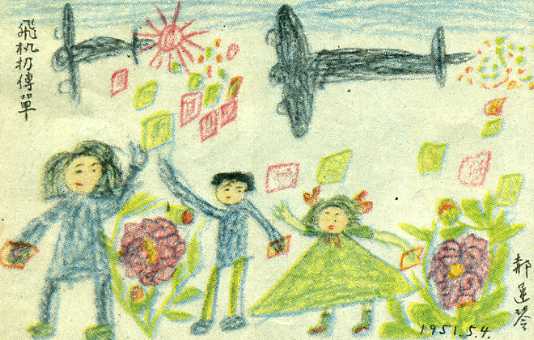 在“五一”劳动节的时候,毛主席在天安门检阅,叔叔阿姨们在街上示威大游行,飞机在空中撒传单,小朋友们在花园里高兴地跑着、嚷着抢传单。