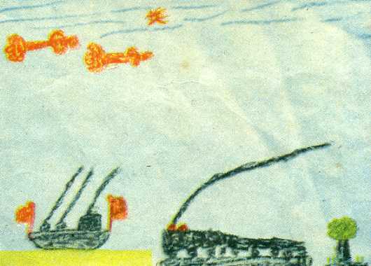 美国坏蛋的飞机到我们海边来了,海军叔叔把飞打坏了,一个个的坏蛋都掉下水淹死了。