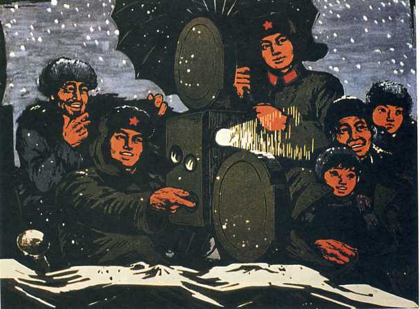 版画《放映队到山村》李忠士 1971年