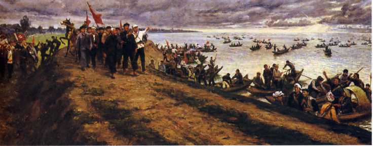 油画《洪湖黎明》(102x240cm)恽圻苍 1957年