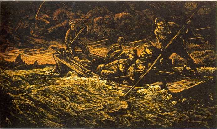 版画《强渡黄河》(28x47cm)肖林 1957年