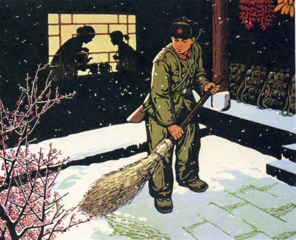 版画《画画我们的老队长》郭礼成(工人)