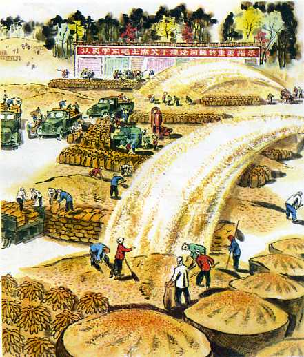 (7)三年大旱夺高产,扬金洒玉满场欢。革命理论指航向,誓为人类多贡献。