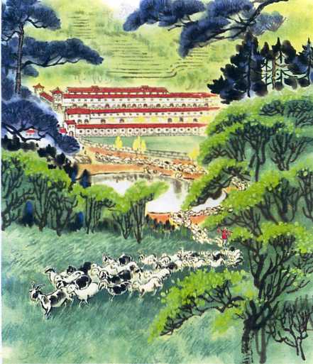 (8)青松翠柏涛声喧,羊群如云走山川。大寨路上四季春,农林牧副齐发展。