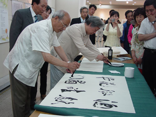 “中韩书画作品联展”开幕式上,韩国庆州市副市长李载雄,韩国艺总庆州支部支部长金仁植,各个艺术团体负责人,陕西长安书画艺术研究院代表团及相关人员参加,展出书画、摄影等艺术作品共计200余幅。我院书画家们参展的书法作品共40余幅,其中:书法作品15幅,国画作品20多幅。“中韩书画作品联展”开幕式由韩国艺总庆州支部支部长金仁植先生主持,韩国庆州市副市长李载雄、陕西长安书画艺术研究院代表团团长叶炳喜分别致辞,共叙中韩友谊,介绍民族艺术,恭祝展览成功。开幕式结束后,双方艺术家认真参观了展出作品,并现场挥毫,互留墨宝,以资纪念。