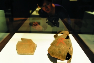今天,400多件价值连城的珍贵文物将在首博集中露面。其中将近七成文物,都是首次与公众见面。昨天,首博展厅已经布展完毕。记者在现场看到,一件扁壶残片静静地躺在玻璃柜中。专家介绍说,扁壶上的毛笔朱书,将是此次展出的焦点。据当年毛笔朱书的发掘见证人、中国社会科学院考古研究所研究员高炜介绍,这件文物是中国文字发展史上的重要标本,它的发现将中国文字史向前推进了将近800年。